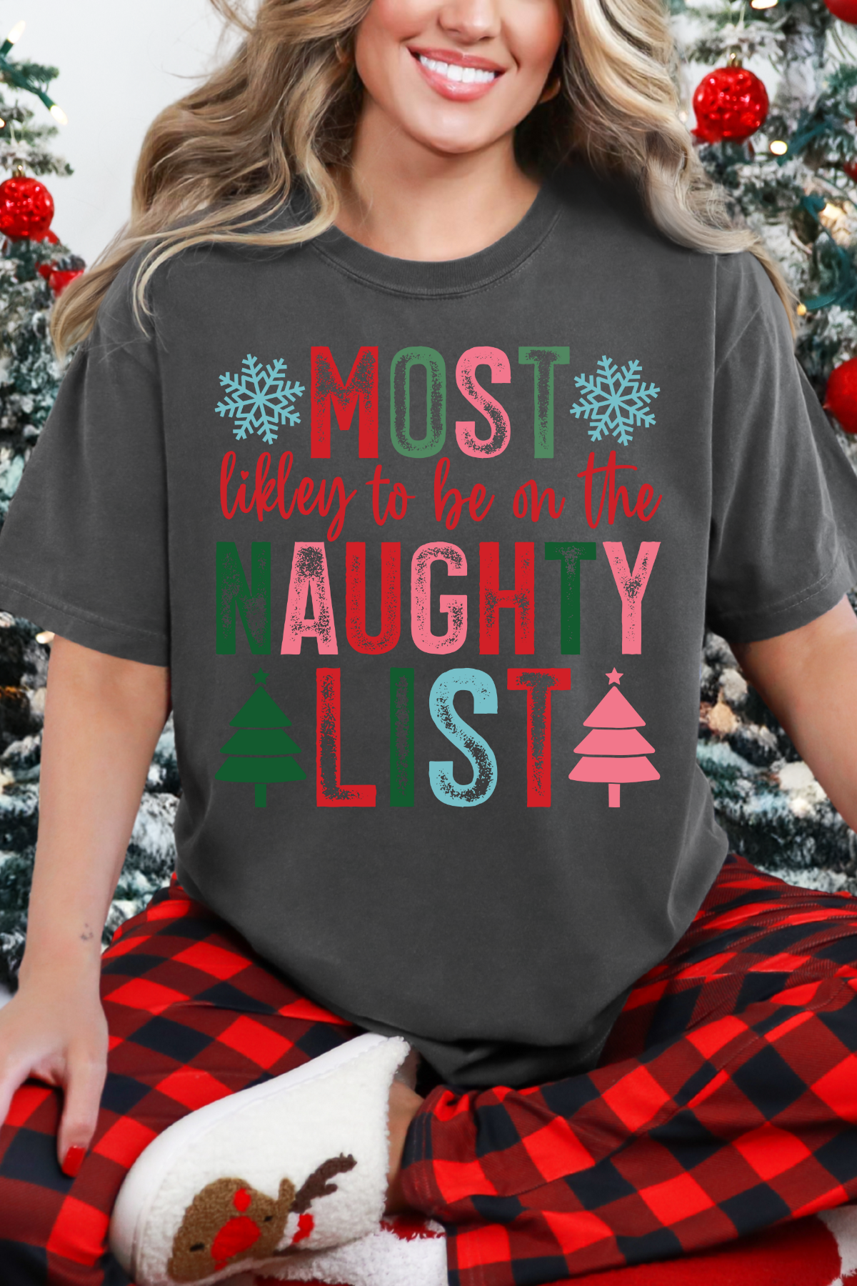 Show off your mischievous side with the Most Likely To Be On The Naughty List Tee. This playful graphic tee adds fun to any outfit, perfect for those who love a little cheekiness in their style. Comfortable and casual, it’s ideal for holiday parties or anytime you want to make a bold, lighthearted statement.