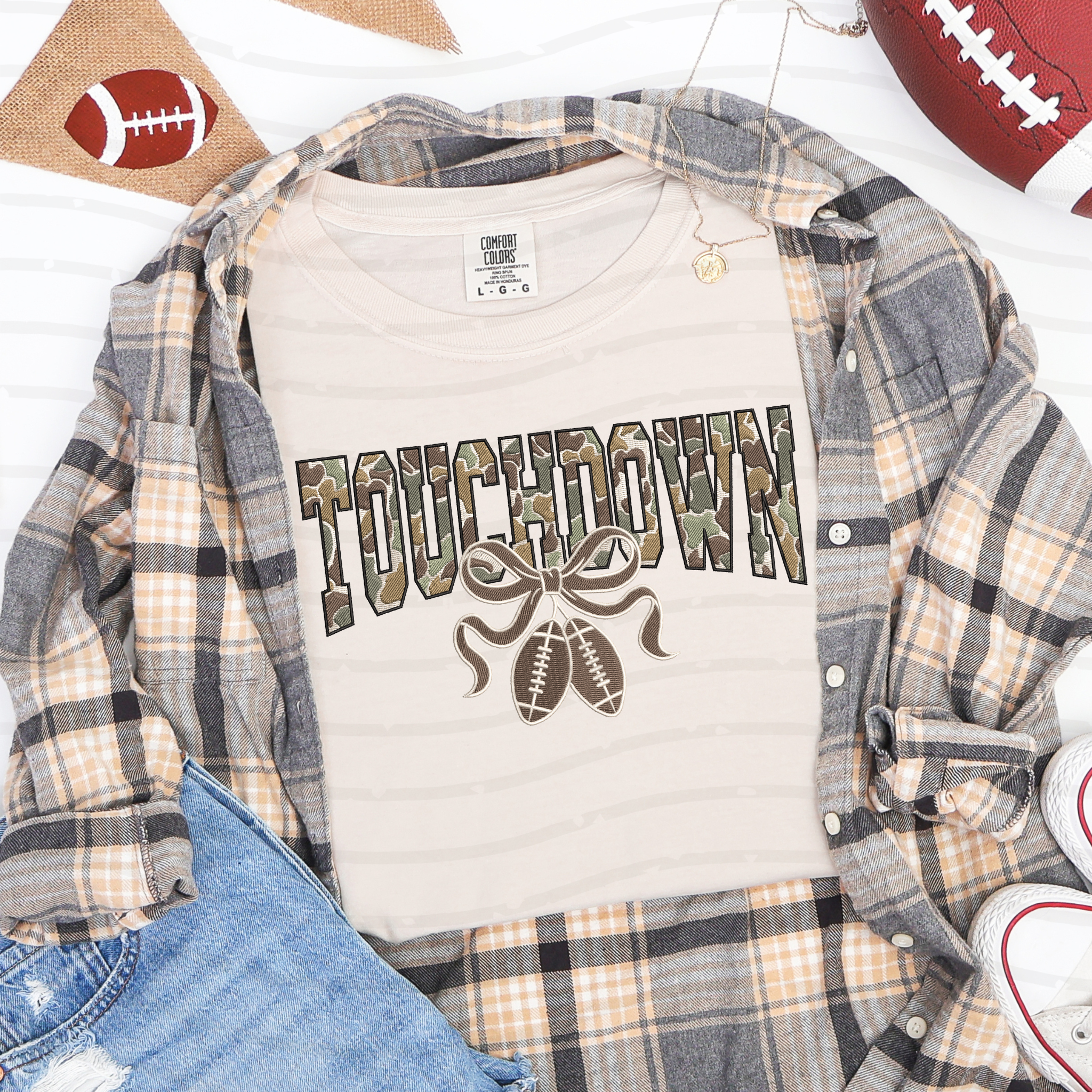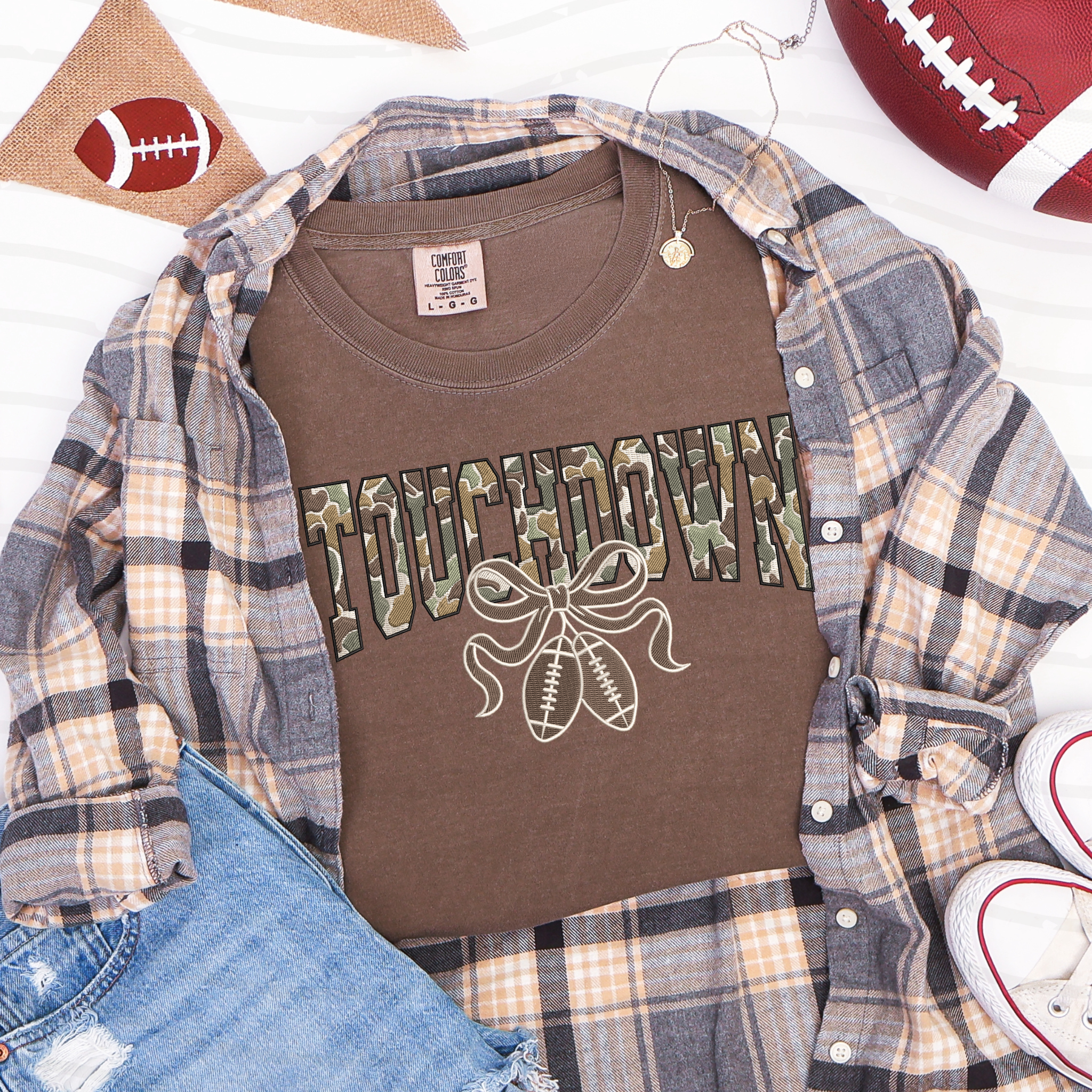 Add a splash of fun to your wardrobe with the Camo Touch Down Coquette Bow Tee. Featuring a stylish camo print and a charming bow detail, this tee brings playful flair to your everyday look. Soft and comfy, it’s perfect for adventures where you want to stand out with a touch of quirky charm.